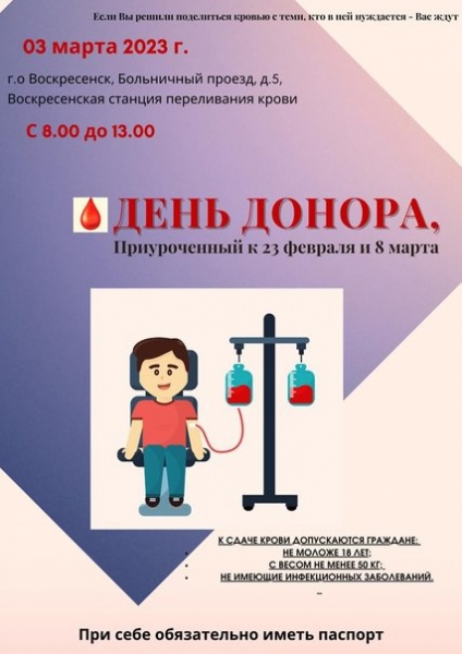 Воскресенское отделение Российского Красного Креста совместно с отделом по работе с молодежью г.о. Воскресенск при поддержке АО «Воскресенские минеральные удобрения» объявляют 03 марта 2023 г. праздничным Днём донора. Акция приурочена к 23 февраля и 8 марта.