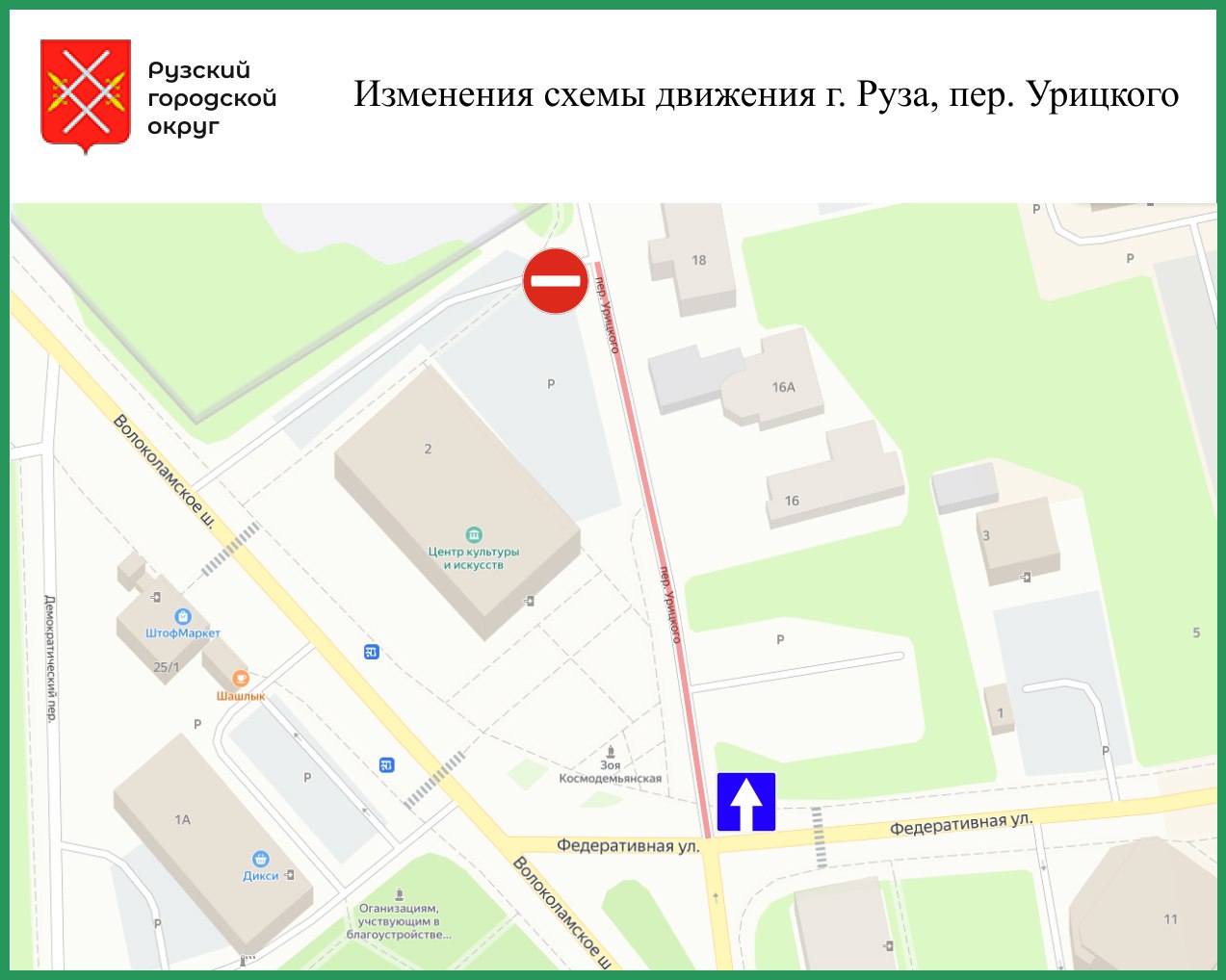 Администрация Рузского городского округа уведомляет жителей Рузы об изменении схемы движения по переулку Урицкого. На участке дороги возле Рузского центра культуры и искусств введено одностороннее движение согласно прилагаемой схеме. Будьте внимательны!