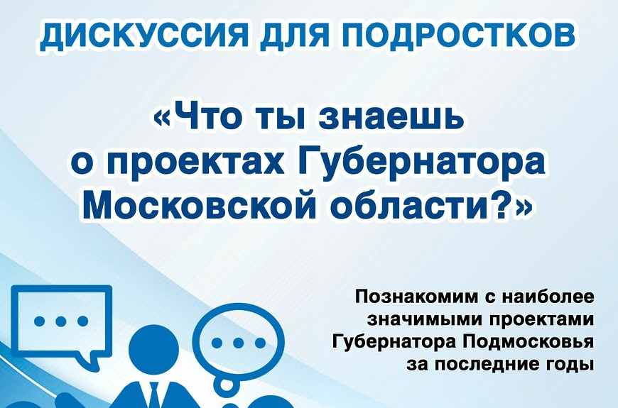 14 июля состоится дискуссия для подростков на тему: «Что ты знаешь о проектах Губернатора Московской области?»