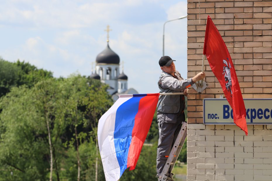 Сотрудники подрядной организации и коммунальных служб 11 июня провели монтаж флагового оформления в Воскресенском.