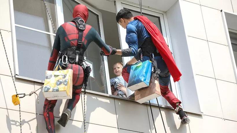 Девять волонтеров-альпинистов в костюмах супергероев и сказочных персонажей поздравили с Международным днем защиты детей маленьких пациентов Московского областного онкодиспансера в Балашихе и вручили им подарки,