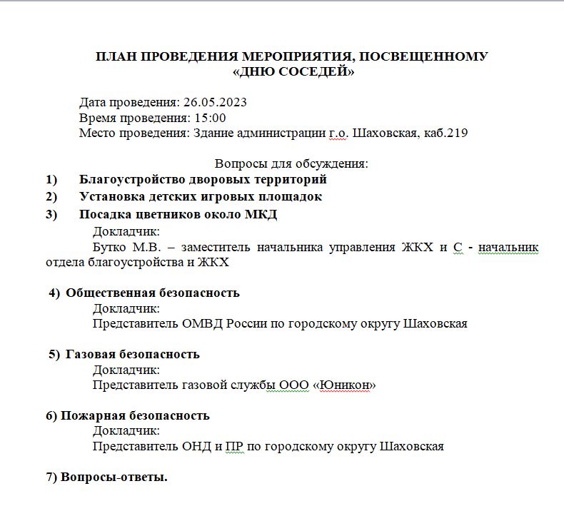 План проведения мероприятия, посвещенному "Дню соседей"