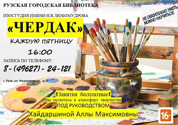 Рузская городская библиотека приглашает жителей 13 октября в 16 часов в изостудию имени Н.В. Любомудрова «Чердак» под руководством А.М. Хайдаршиной.