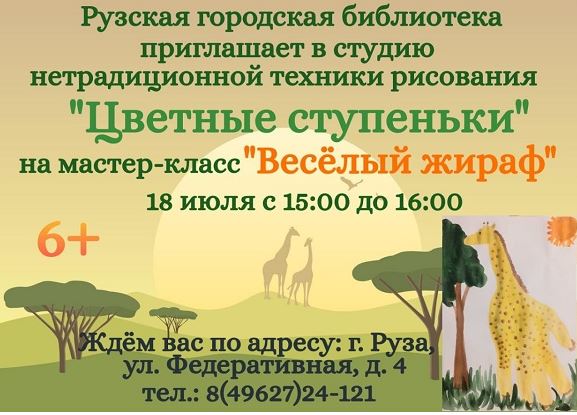 Рузская городская библиотека приглашает детей от 6 лет Рузского городского округа в студию нетрадиционной техники рисования «Цветные ступеньки» на мастер-класс «Веселый жираф».