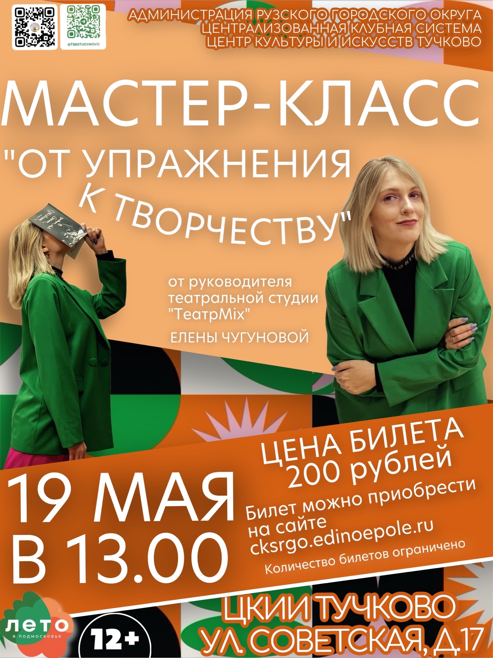 19 мая в Тучковском центре культуры и искусств Рузского городского округа состоится мастер-класс по актёрскому мастерству "От упражнения к творчеству".