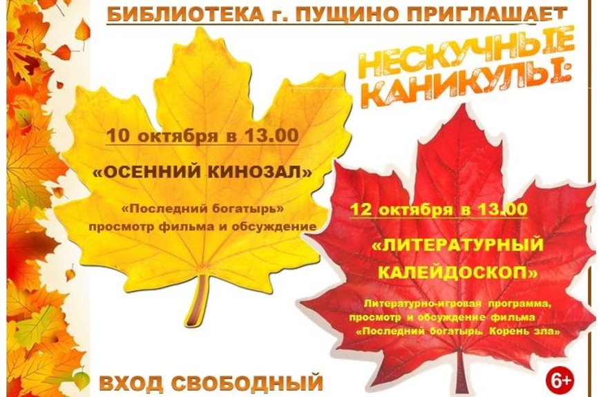 В дни каникул сотрудники библиотеки Пущино подготовили для ребят различные познавательные мероприятия. Так 10 октября в 13.00 состоится показ фильма «Последний богатырь», а литературно-игровая программа пройдет 12 октября в 13.00.