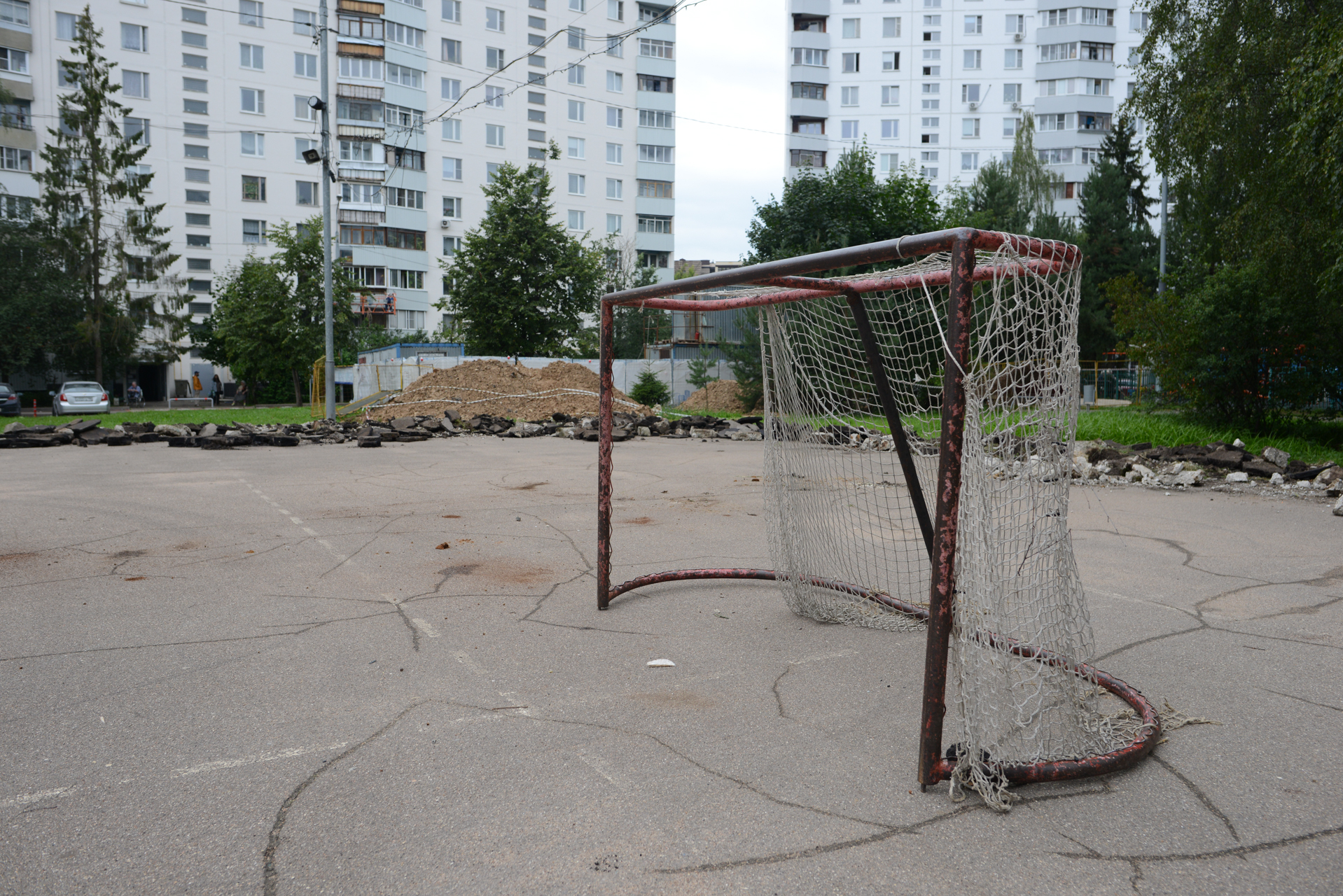 Отбойный молоток методично вскрывает асфальт, медленно двигаясь по периметру поля. Борта, которые пару дней назад стояли на своих местах, демонтированы и увезены. Ремонт хоккейной коробки на улице Солнечной начат на прошлой неделе. На реконструкцию отведён один месяц.