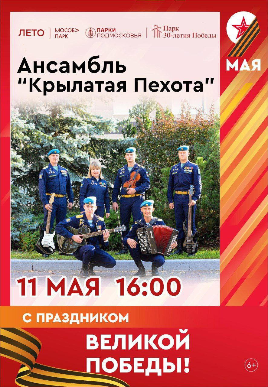 Завтра, 11 мая, в Парке Победы пройдёт концертная программа ансамбля «Крылатая пехота» Рязанского гвардейского высшего воздушно-десантного командного училища — «Поём о Родине и Великой Победе!».