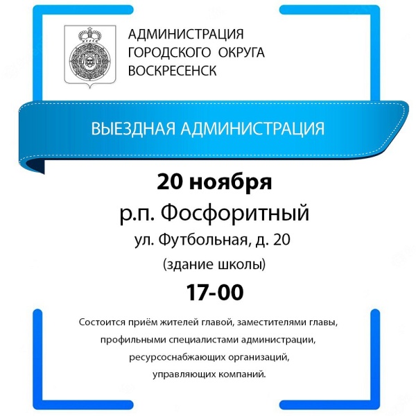 20 ноября в 17:00 в формате выездной администрации состоится приём жителей главой городского округа Воскресенск, заместителями главы, профильными специалистами администрации, ресурсоснабжающих организаций и управляющих компаний.
