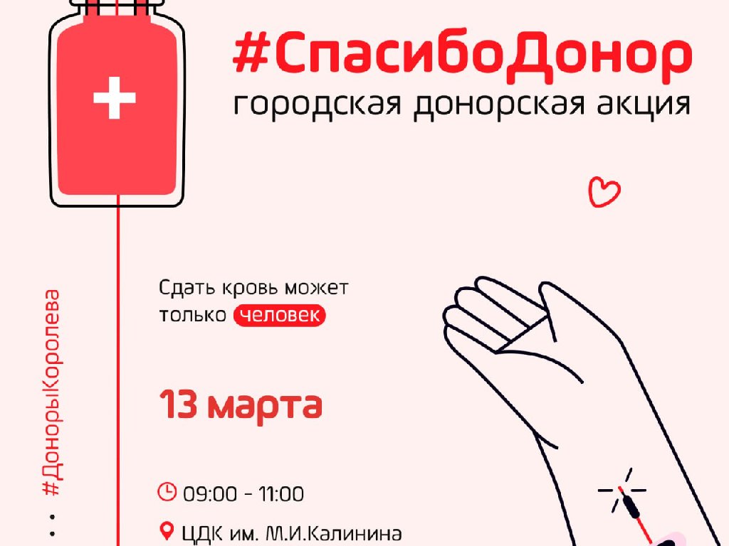 13 марта с 9:00 до 11: 00 в ЦДК им. М.И. Калинина пройдёт донорская акция #СпасибоДонор