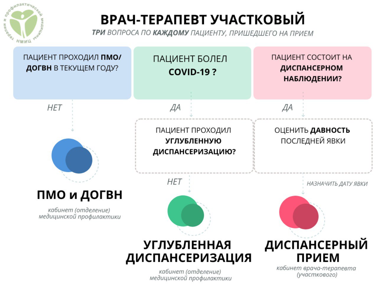 В каждом из двух случаев врач-терапевт должен оценить необходимость дальнейшей маршрутизации пациента по одному из трех названных процессов, задав себе всего 3 вопроса, которые представлены в графике.