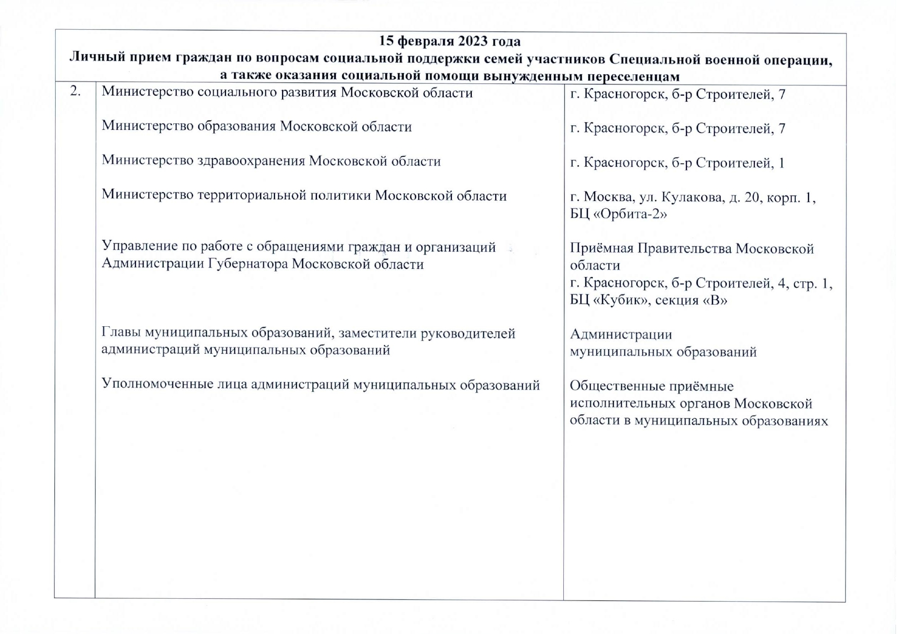 15 февраля 2023 года с 10:00 до 15:00 состоится личный прием граждан по вопросам социальной поддержки семей участников Специальной военной операции, а также оказания социальной помощи вынужденным переселенцам.